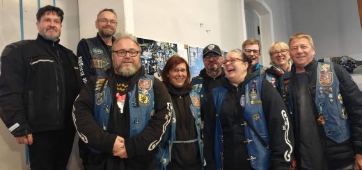 Cool war`s, mit ca. 50 Gästen, welche unserer Einladung zu unserer Jubiläumsfeier folgten. Cool war die Reaktion unserer Gäste auf das Schloss, auf unsere Ausfahrt mit Stopp am Schiffshebewerk Niederfinow und cool war der etwas andere Bikergottesdienst in der Kirche Friedrichswalde bei Pfarrer Ralf Schwieger! Hier konnten wir die Gelegenheit gleich nutzen und unseren Patenkindern vom Oberlinhaus Potsdam feierlich eine Spende überreichen. Stolz waren wir am Samstagabend! Hatte doch bis dahin alles prima geklappt. Die gemeinsame Fahrt bis nach Friedrichswalde verlief ohne Probleme. Der Pfarrer war vorbereitet und hielt einen Gottesdienst der alle beeindruckte und das in Begleitung einer Solistin welche Rockmusik mal anders aufführte. Die Touren anschließend fanden Zustimmungen, der Stopp am Schiffshebewerk kam gut an! Nutzten doch einige die Gelegenheit während einer Fahrt mit dem FGS „Luise“ durchs Hebewerk, das neuste von der Baustelle nebenan zu erfahren. Zurück im Schloss konnten alle ihr Lederbier genießen! Keine Zwischenfälle auf der Strecke, keine Liegenbleiber mit einem Schaden einfach nichts passiert! Hier schon mal unser Dank an ALLE dafür!!! Und der Abend? Tja, der war mal mit etwas anders wie gewohnt, so glauben wir. Ein Auftritt der Big Band des Polizeiorchesters des Landes Brandenburg gab es bestimmt in solcher Runde noch nicht. Zumal diese keine Ahnung hatten vor welchem Publikum sie auftreten! Ein Bedürfnis unseres Presidenten war es, die Gründungsmitglieder welche noch dabei sind zum „Ritter“ zu schlagen! Die Augen und die Freude waren bei Jürgen, Andreas, Ulf, Ulli und Peter ganz deutlich zusehen.