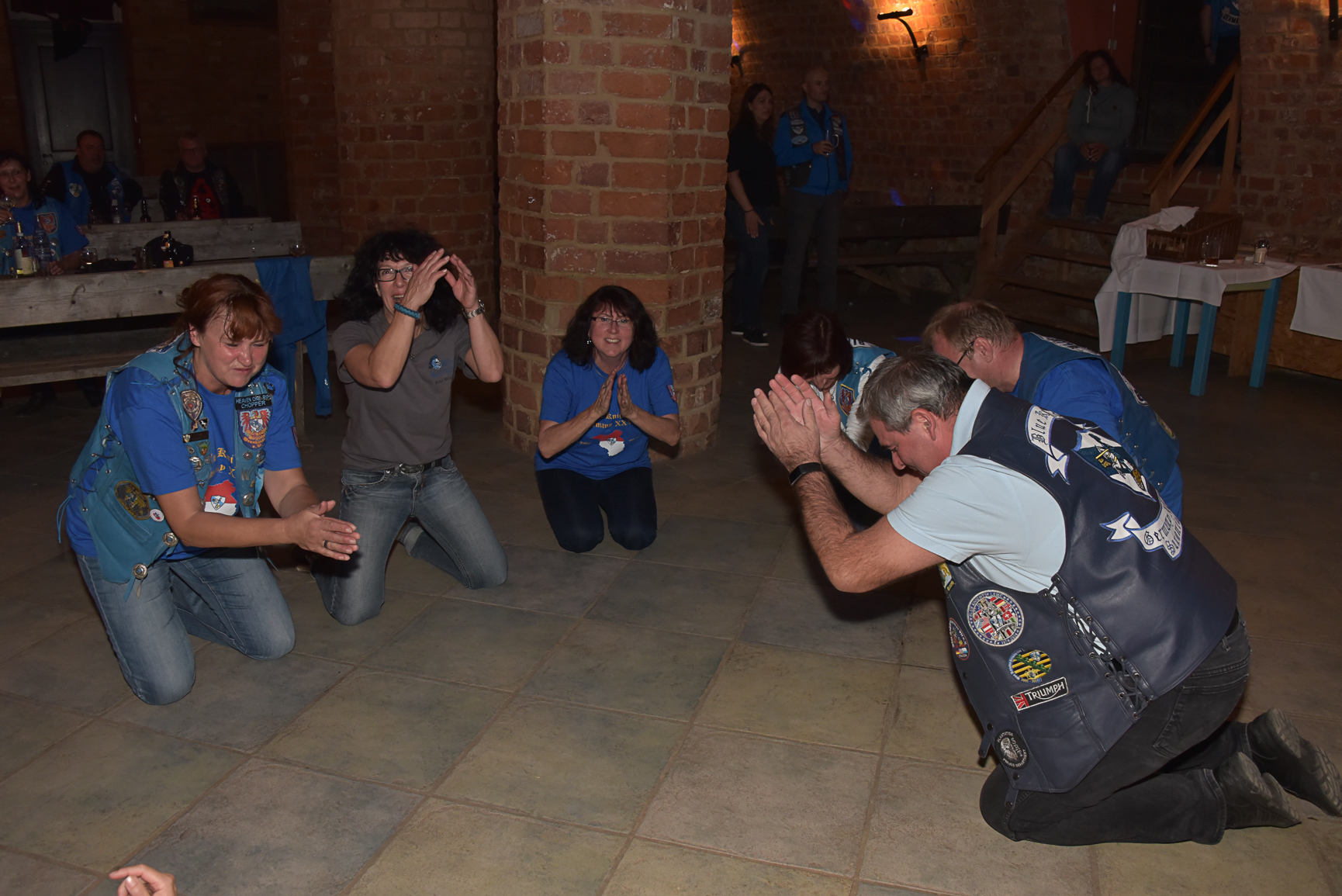 Cool war`s, mit ca. 50 Gästen, welche unserer Einladung zu unserer Jubiläumsfeier folgten. Cool war die Reaktion unserer Gäste auf das Schloss, auf unsere Ausfahrt mit Stopp am Schiffshebewerk Niederfinow und cool war der etwas andere Bikergottesdienst in der Kirche Friedrichswalde bei Pfarrer Ralf Schwieger! Hier konnten wir die Gelegenheit gleich nutzen und unseren Patenkindern vom Oberlinhaus Potsdam feierlich eine Spende überreichen. Stolz waren wir am Samstagabend! Hatte doch bis dahin alles prima geklappt. Die gemeinsame Fahrt bis nach Friedrichswalde verlief ohne Probleme. Der Pfarrer war vorbereitet und hielt einen Gottesdienst der alle beeindruckte und das in Begleitung einer Solistin welche Rockmusik mal anders aufführte. Die Touren anschließend fanden Zustimmungen, der Stopp am Schiffshebewerk kam gut an! Nutzten doch einige die Gelegenheit während einer Fahrt mit dem FGS „Luise“ durchs Hebewerk, das neuste von der Baustelle nebenan zu erfahren. Zurück im Schloss konnten alle ihr Lederbier genießen! Keine Zwischenfälle auf der Strecke, keine Liegenbleiber mit einem Schaden einfach nichts passiert! Hier schon mal unser Dank an ALLE dafür!!! Und der Abend? Tja, der war mal mit etwas anders wie gewohnt, so glauben wir.  Ein Auftritt der Big Band des Polizeiorchesters des Landes Brandenburg gab es bestimmt in solcher Runde noch nicht. Zumal diese keine Ahnung hatten vor welchem Publikum sie auftreten! Ein Bedürfnis unseres Presidenten war es, die Gründungsmitglieder welche noch dabei sind zum „Ritter“ zu schlagen! Die Augen und die Freude waren bei Jürgen, Andreas, Ulf, Ulli und Peter ganz deutlich zusehen.
