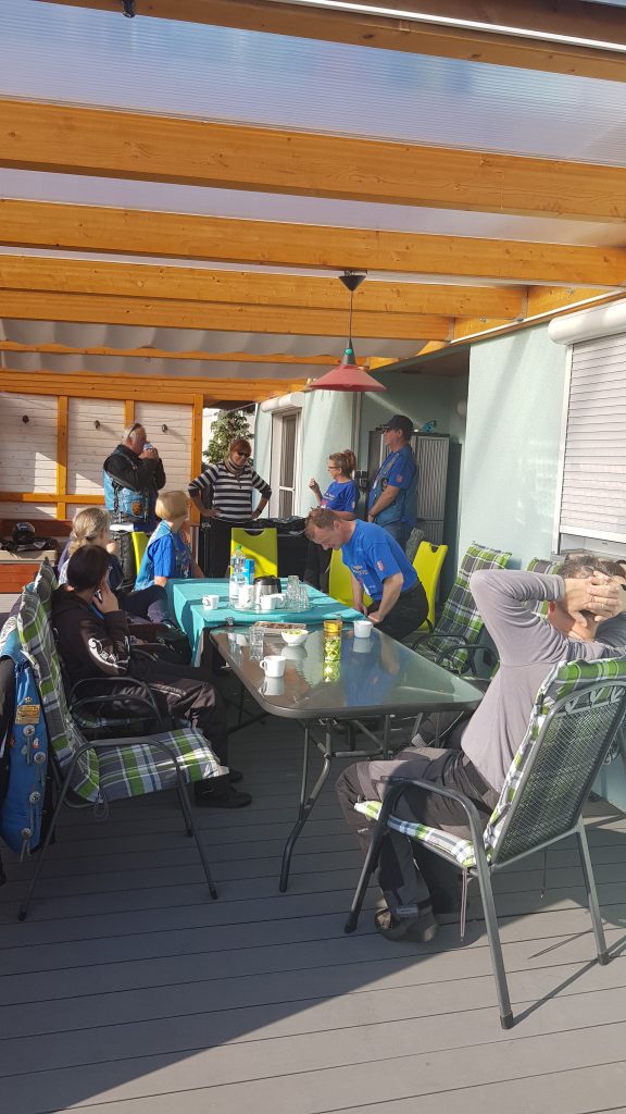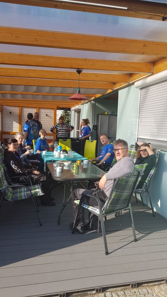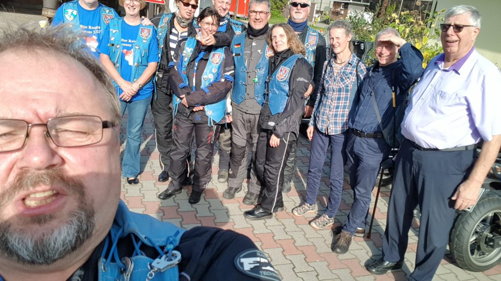Ein sicheres Zeichen, wir sind da! Hatten wir doch schon bei der Anreise zum Treffpunkt für unsere Saisonabschluss-Ausfahrt, unsere Fahne im Garten von Uwe und Claudi entdeckt. Mit einem Lächeln und einer festen Umarmung, so machen wir das zur Begrüßung, luden uns beide auf eine kleine Stärkung ein! Zu zehnt waren wir und der Polizeipfarrer Sven mit seiner Gattin. Sie ließen es sich nicht nehmen uns zu begleiten! Burghardt führte uns übers Land, Straßen welche nicht nur mir neu waren, bis nach Nonnendorf. Im Gasthof Schliebener (www.gasthof-schliebener.de/) empfingen uns bekannte Gesichter Freude und Lust uns was Gutes zu tun! Eigentlich sind wir viel zu selten da!!!